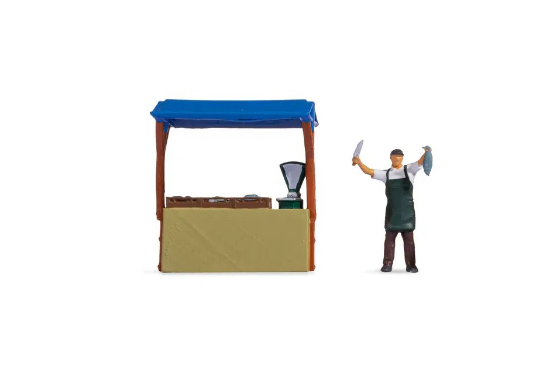 With the Tiny Scenes, you can create a realistic weekly market on your model landscape. In this scene there is a fish stall and a vendor. The brown stall has a blue roof to protect the fish placed in boxes. The salesman is wearing a white T-shirt as well as dark trousers and a blue work apron. He holds a fish in one hand and a knife in the other. To draw attention to his sales stand, he stretches both hands upwards.